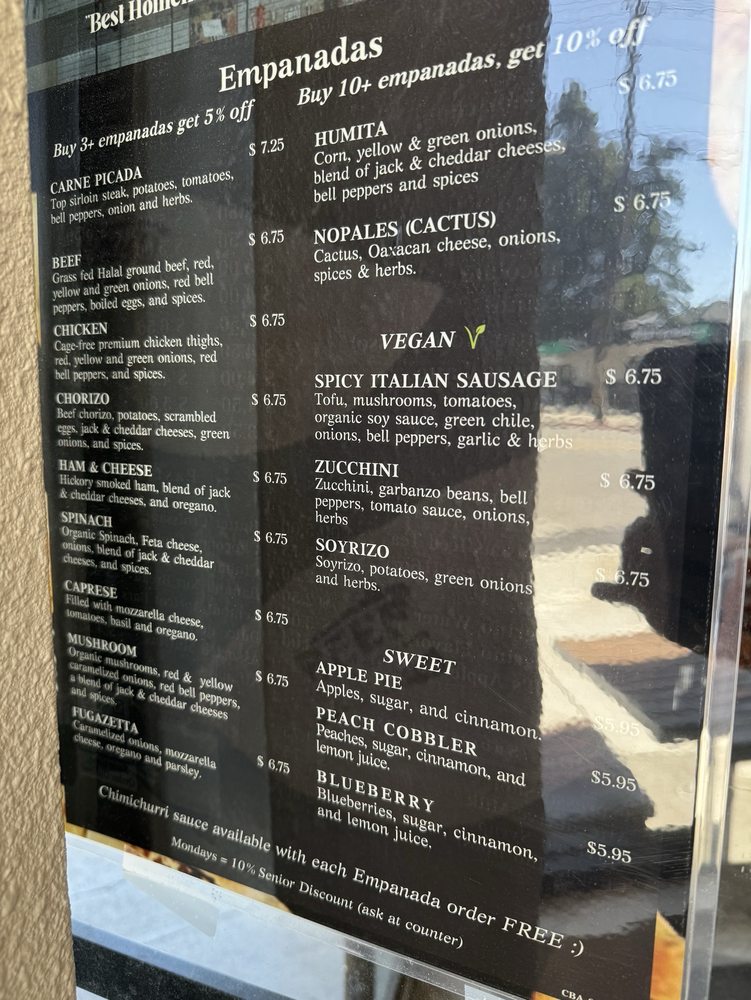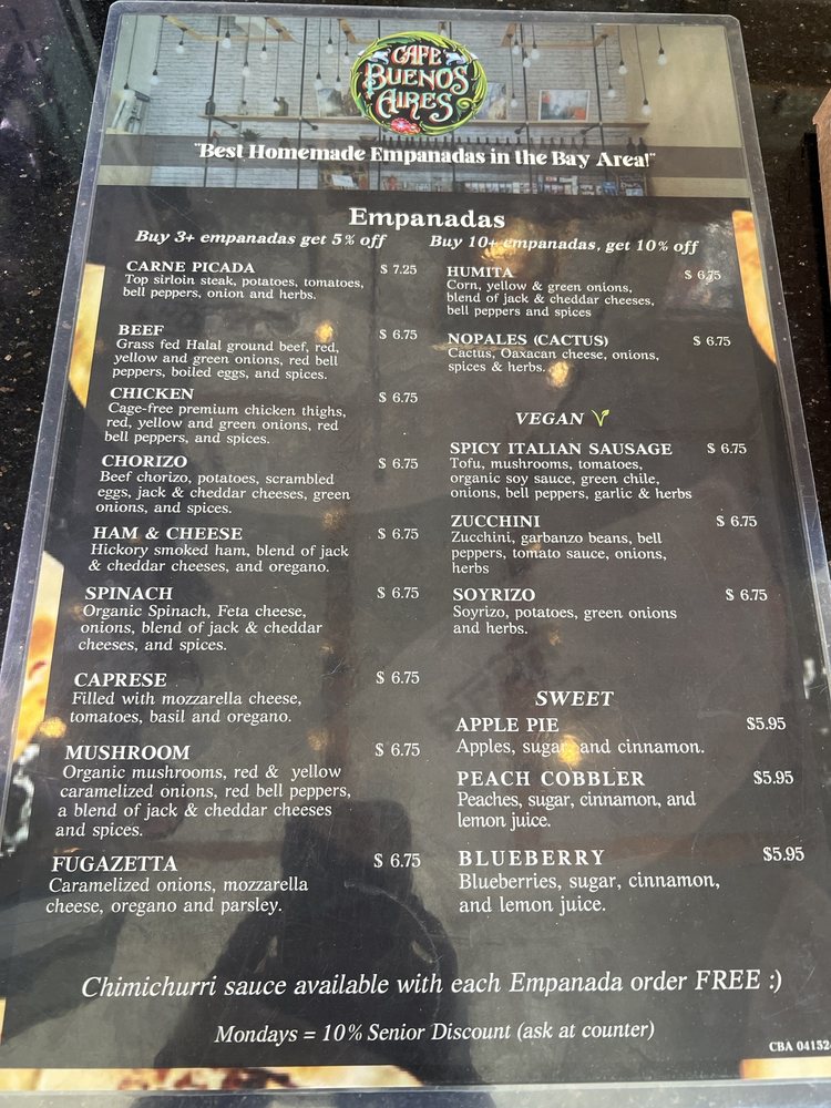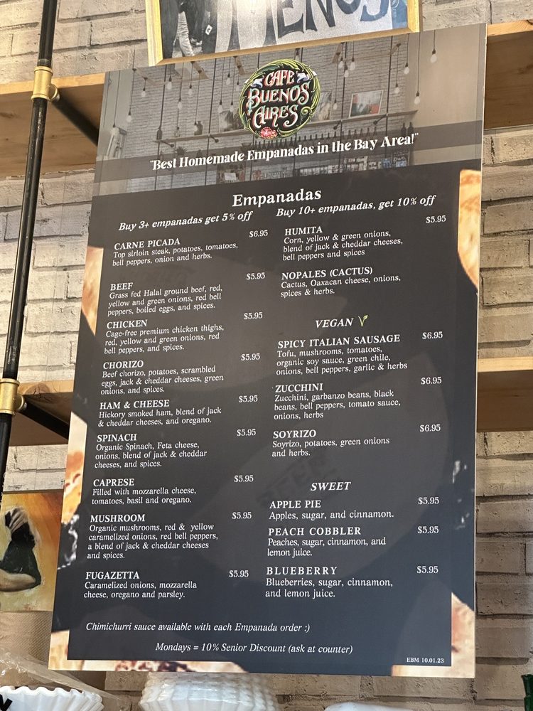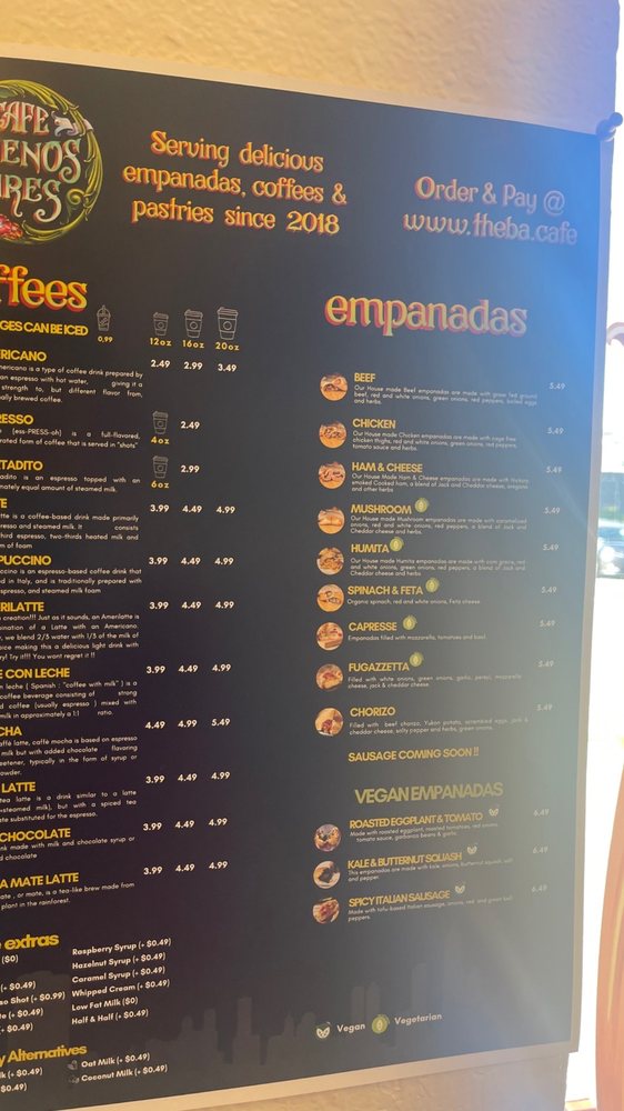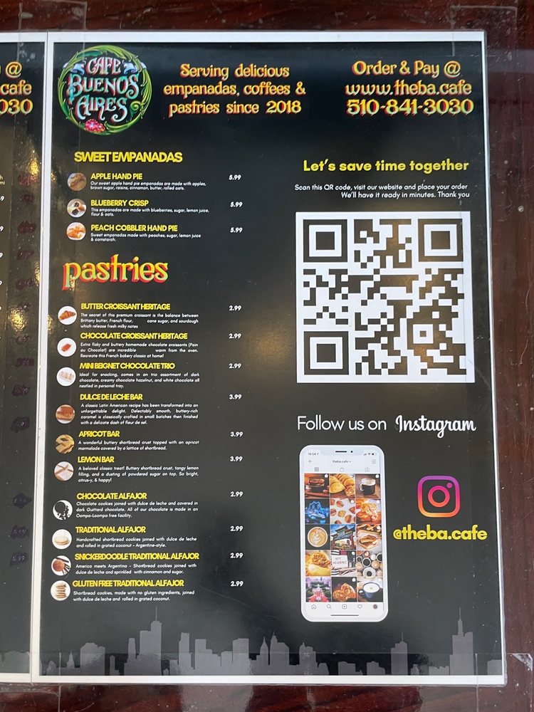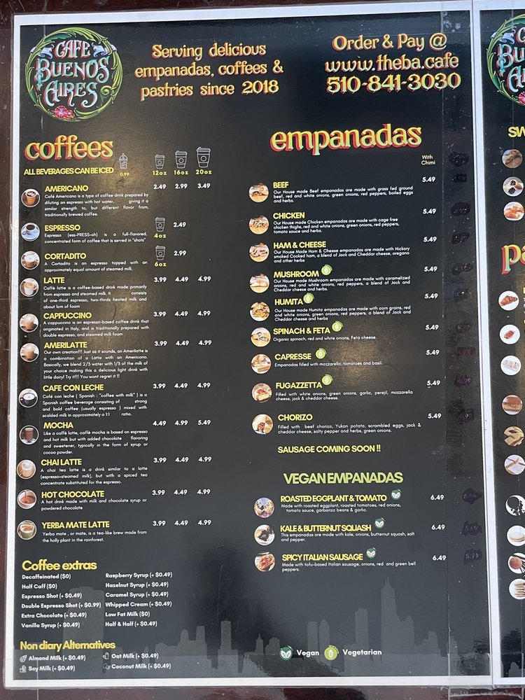 Cafe Buenos Aires in Berkeley, CA offers a delightful menu of Argentine pastries, coffees, and sweet empanadas. Their selection includes delectable treats like Apricot Bar, Banana Nut Pound Cake Slice, and Butter Croissant Heritage. For coffee lovers, options like Americano and Amerilatte provide a unique twist on classic beverages. The star of the show is their Sweet Empanadas, with flavors like Apple Pie, Blueberry Pie, and Peach Cobbler. Customers rave about the quality of the empanadas, with options for both meat lovers and vegetarians. The cozy ambiance and friendly staff make Cafe Buenos Aires a top choice for a relaxing meal or coffee break. Don't miss out on this Latinx-owned gem for a taste of authentic Argentine flavors in the heart of Berkeley.